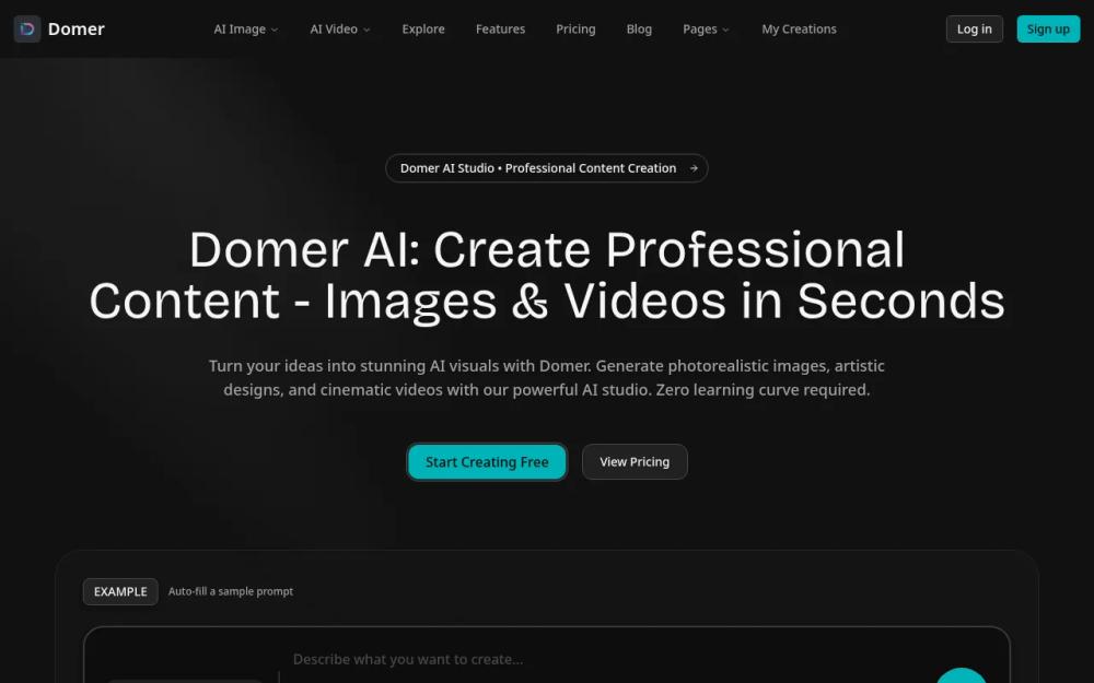Domer AI is an all-in-one image and video generator tool that allows users to create high-quality visuals from text descriptions instantly, with 10 free credits to start.