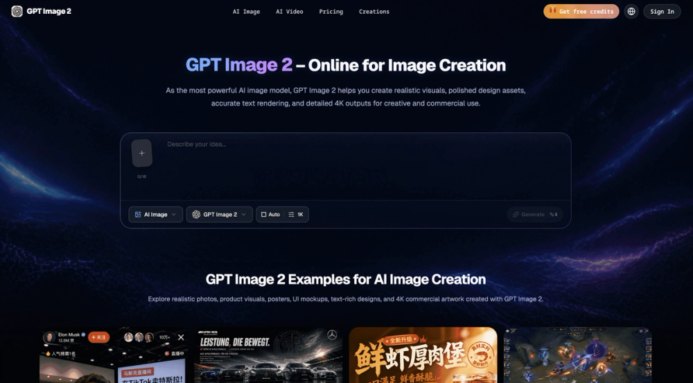 As one of the most capable AI image models available today, GPT Image 2 helps you create realistic visuals, polished design assets, accurate text rendering, and detail-rich 4K images for creative and commercial use.